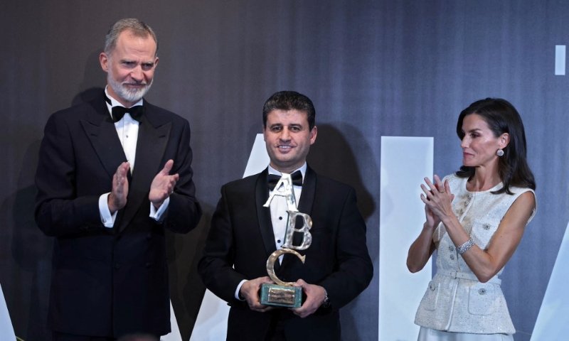 King of Spain Felipe VI (L) and Queen of Spain Letizia present Spain's prestigious Mingote Prize to AFP photographer Said Khatib (C), a Palestinian photojournalist from the Gaza Strip, in Madrid on July 18, 2024. © Thomas Coex / AFP