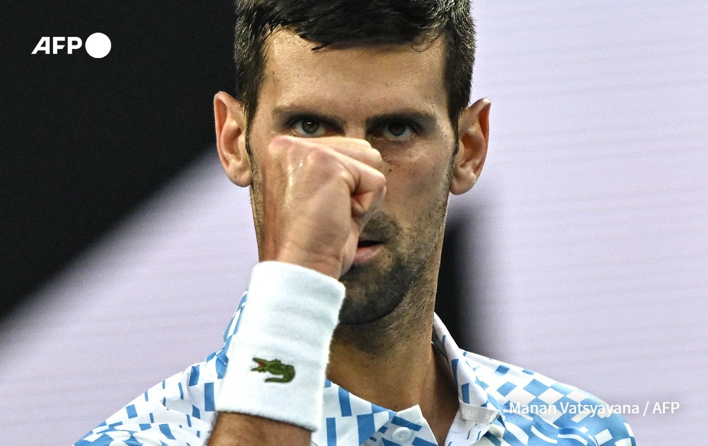 Serbia's Novak Djokovic reacts as he competes against Australia's Alex De Minaur during their men's singles match on day eight of the Australian Open tennis tournament in Melbourne on January 23, 2023.