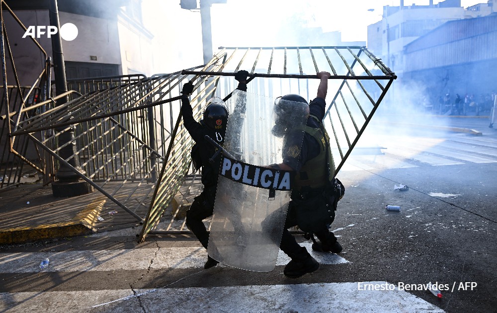 Riot policemen remove protective fences during a protest against the government of Dina Boluarte asking for her resignation and the closure of Congress, in Lima on January 24, 2023. Peru's President Dina Boluarte called for a "national truce" as thousands of protesters continue to call for her resignation and fresh elections, following weeks of protests that have at times turned violent, with at least 46 people killed in clashes between demonstrators and security forces.
