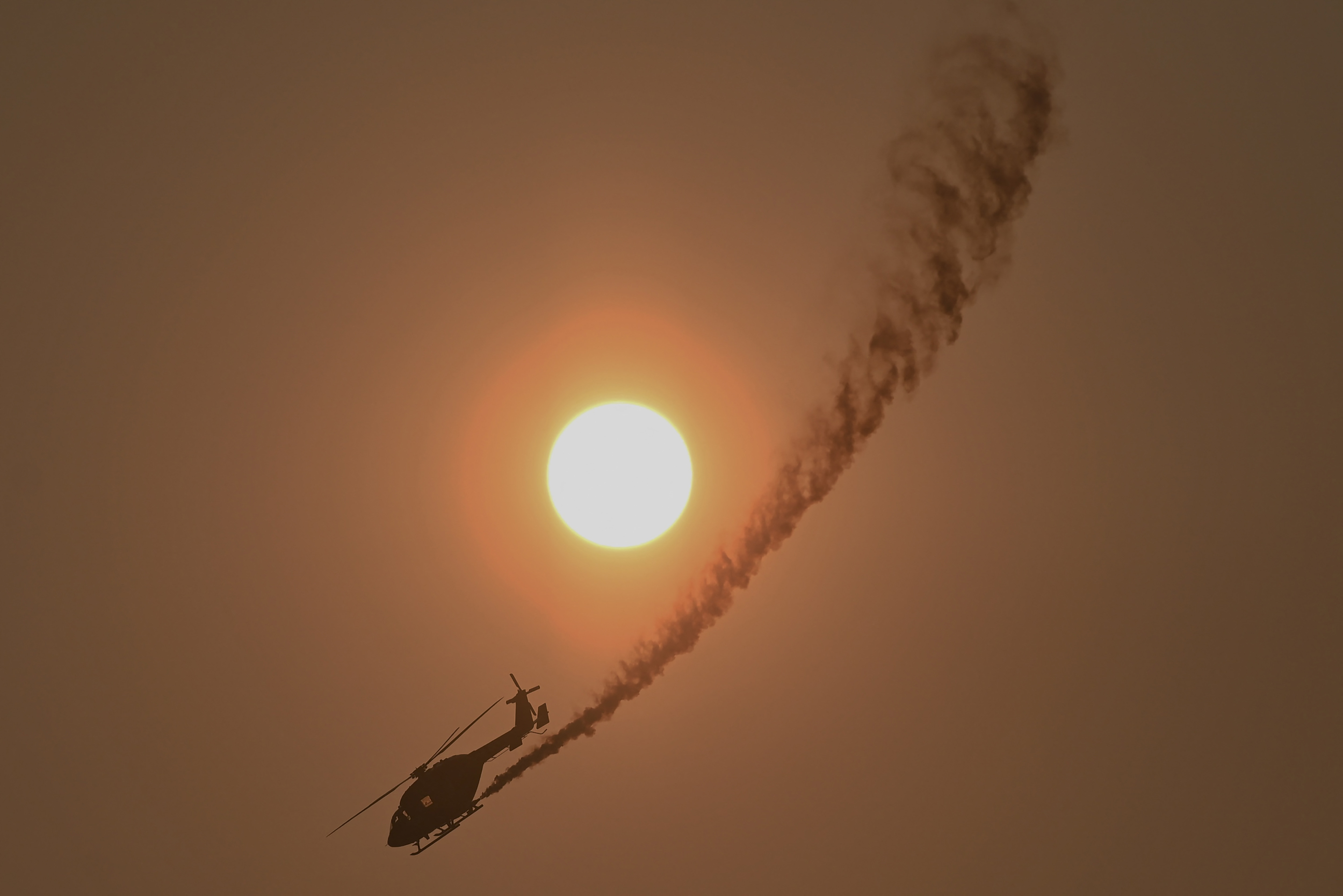 • Photo 8 - L’hélicoptère est-il en difficulté ? Non, il s’agit d’une démonstration de l’armée de l’air au Sri Lanka. D’où l’importance d’avoir une légende et un photographe professionnel sur place qui recontextualise car on peut faire dire beaucoup de choses à une photo.